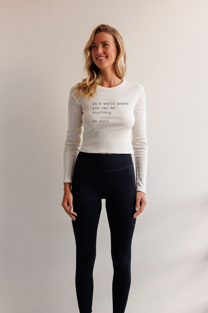 Our baby tee offers a gently snug fit that moves with you—never against you. Designed with intention, it features a slightly more relaxed neckline and a shorter, cropped body that flatters your shape without feeling restrictive.